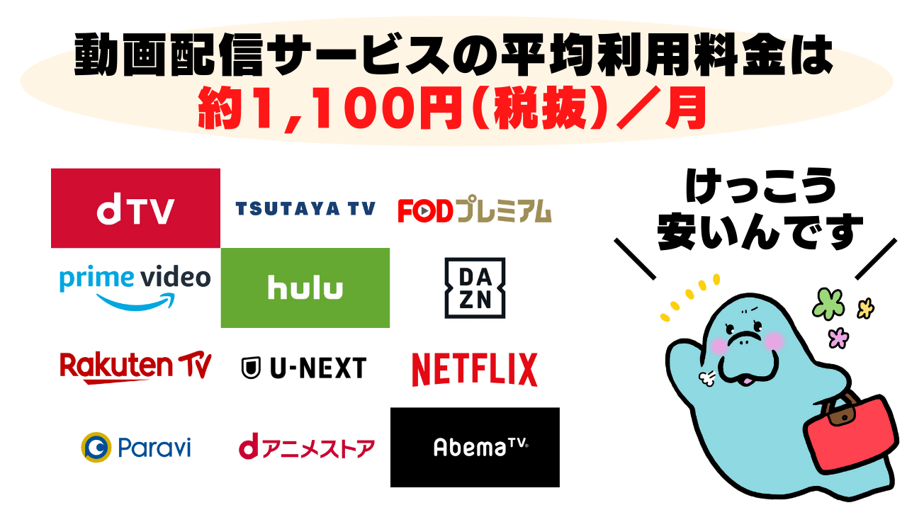 また、動画配信サービスの平均利用料金よりも安いのも魅力の一つです。mvmv.jpで紹介している動画配信サービスの平均額は約1,100円(税込)となっています。