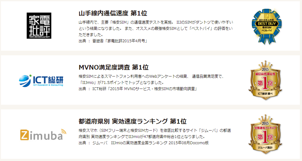 IIJmioは国内のSIMカード契約数No.1、総合満足度No.1、通信速度No.1を受賞しており、格安SIMを提供しているサービスの中でも高品質です。