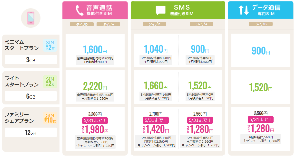 データ容量3GB、6GB、12GB+複数SIM利用で利用状況にあったプランを自由に組み立てることができる、IIJmioが圧倒的に有利です。