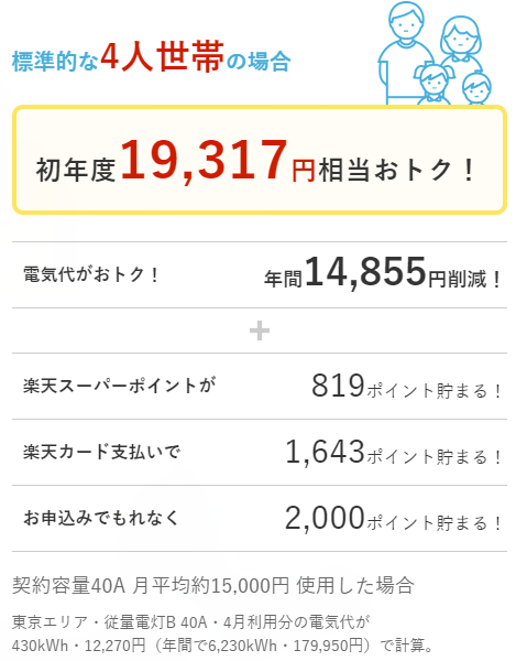 ポイントが効率よく貯まるので、一般的なご家庭が楽天でんきに切り替えると年間1万円以上もお得になることも。