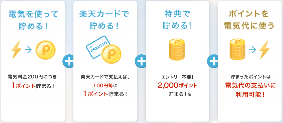 楽天でんきでは、電気料金200円につき1ポイント、楽天カード払いで100円につき1ポイントが貯まります。更に、特典で2,000ポイントが別途付与されるのでお得です。
