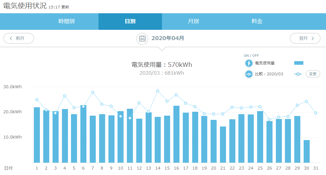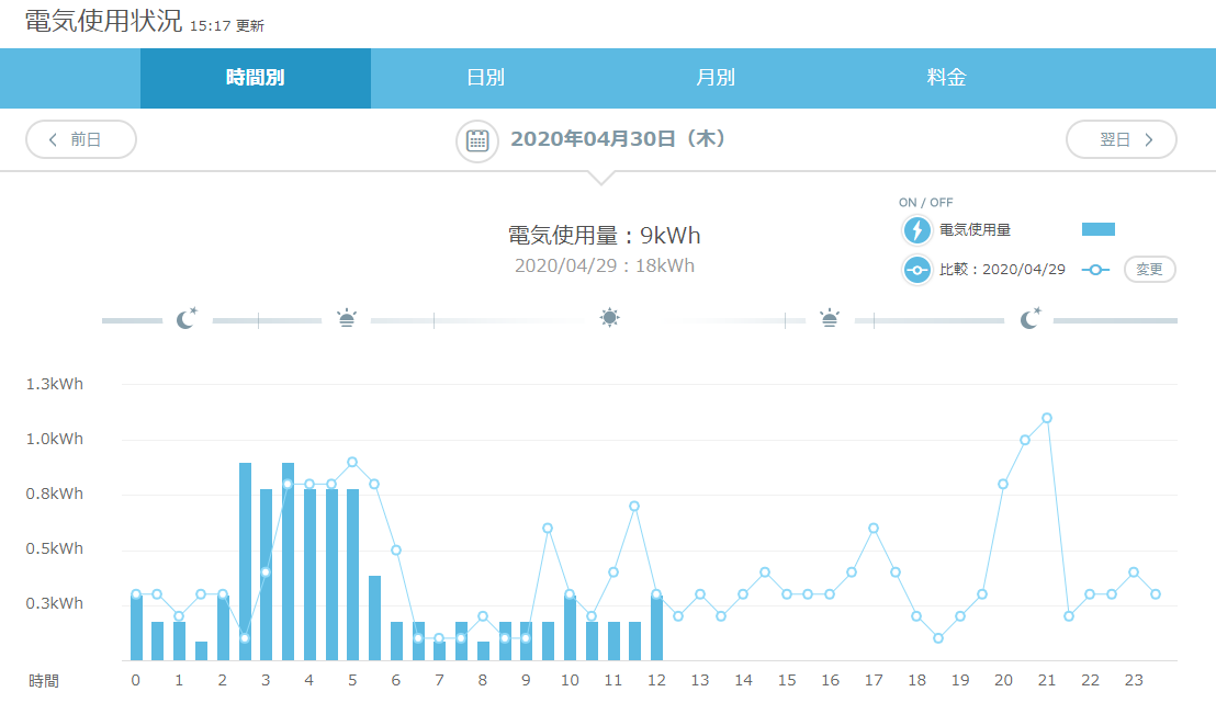 まなすけ時間別、日別、月別に電気使用量を確認できるので、どのような時に電気を使用しているのか一目瞭然です。