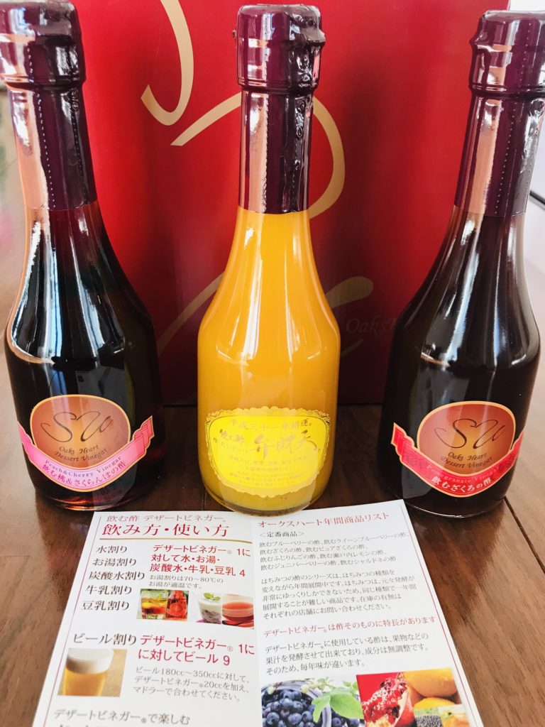 お味は「飲む桃&さくらんぼの酢」「飲む酢 弁財天 橙」「飲むざくろの酢」の3種類入り。試飲させていただいたのは「弁財天 橙」でこれが本当においしかった…!