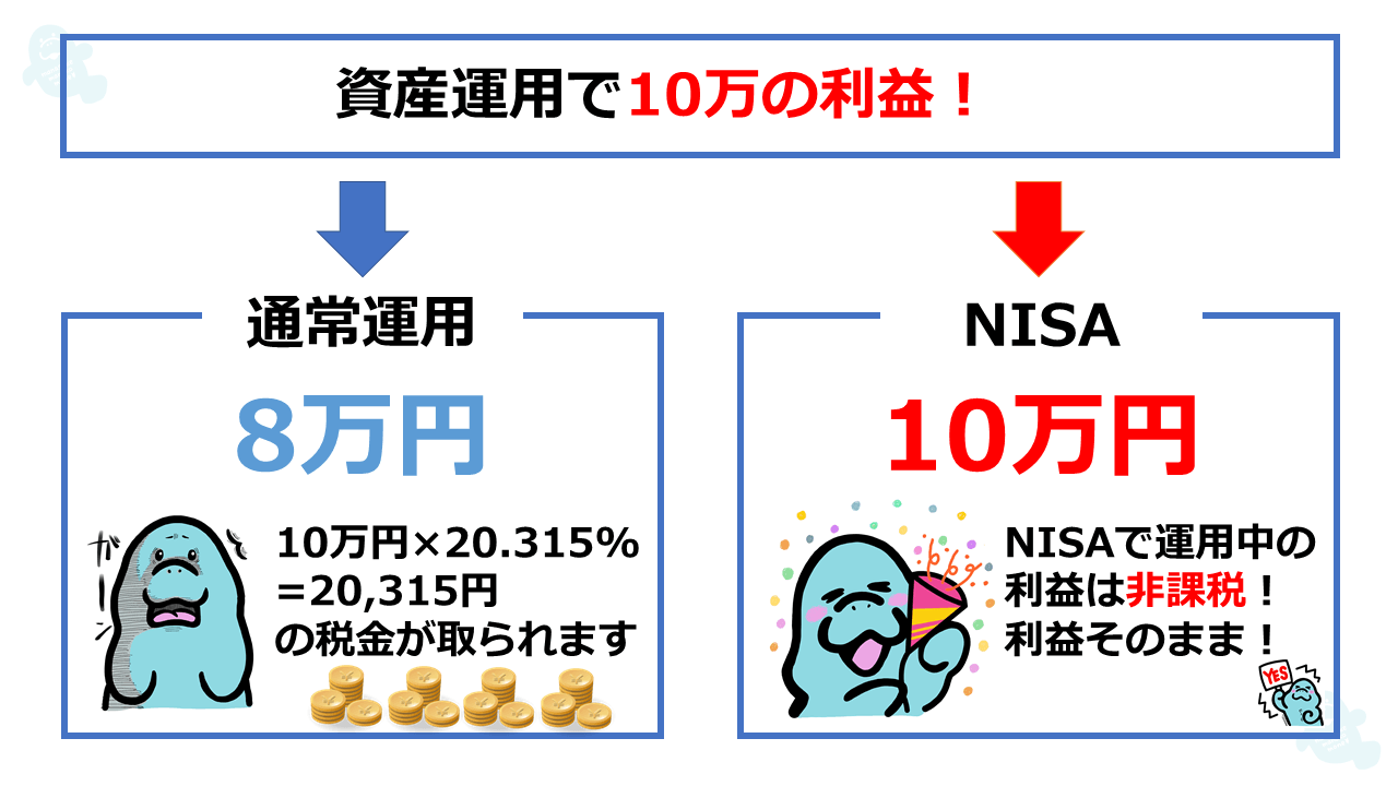 株式取引や投資信託で得た利益の内、通常ならば約20%の税金がかかるところ、NISA口座で得た利益では非課税になるということです。