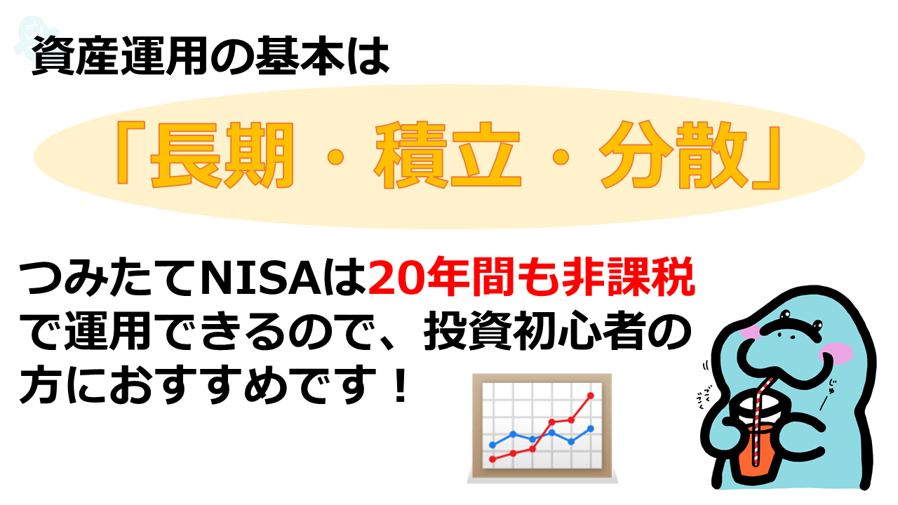 つみたてNISAは20年間もの間、非課税で資産運用をすることができるので、投資の基本である「長期・積立・分散」に向いています。