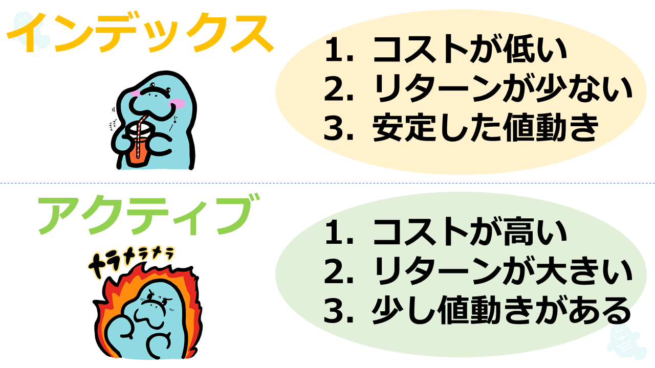 「長期・積立・分散」で少しずつ資産を成長させたい方はインデックス型、リスクをとってリターンを狙いたい方はアクティブ型がおすすめ。